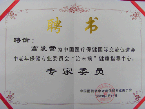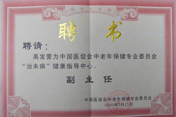 由中国医疗保健国际交流促进会中老年保健专业委员会“治未病”健康指导中心上报国家卫生主管医疗机构审批,中国中医空劲气功学科专家委员、中国疑难病专家委员、世界医学气功学会会员、中国医学气功学会会员、枣庄市益寿医学气功研究中心高发营主任被聘请为中国医疗保健国际交流促进会中老年保健专业委员会“治未病”健康指导中心副主任和专家委员等职。