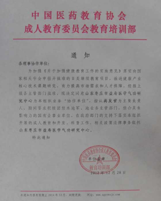 热烈祝贺中国医药卫生继续教育项目协作单位于2013年4月26日在枣庄成立。根据国家加强《关于加强健康教育工作实施意见》文件精神,推进健康产业核心技术课题研究,有力提高市场需求和人才保障,经报上级中国医药教育协会成人教育委员会培训部和北京卫健基业技术培训部等主管部门批准,现决定同意山东枣庄市益寿医学气功研究中心上报的“空劲气医疗法”为本组织业务“协作单位”,并纳入国家医药卫生继续教育项目,为社会新增职业(气疗师和气功指导师),指认高发营为主要负责人,黄仁忠宗师负责考评审查培训职业资格证书工作,期间要求积极团结本地军、地业务主管部门,结合具有影响力的国有企事业单位,在政府部门的支持下落实本组织开展的成人教育和开发、科普工作,相关政策法律事务依托山东枣庄市益寿医学气功研究中心。