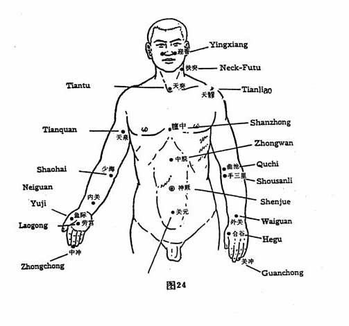 2、接着天突穴处手指的大拇指和小指同时扳下(图18)。停留45秒钟后起指复原梯形式。然后关元穴处的手指同样向上扳动大拇指和小指。停留45秒后二指复原梯形式。(下面只讲指法,扳动方法和停留时间与上面1—2交换扳动一样)。