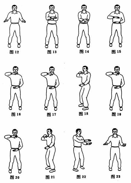 起势,马步站桩二分钟后(图12)。双手臂慢慢靠拢成十字手,右手在上,左手在下。内关与外关相对(图13)。略停一息,然后双手翻掌,使掌心向上(图14)。同时双小臂向身体移动。在移动的同时。右手翻掌。使左右手掌劳宫穴相对(图15),双手掌离开距离约7寸,右手掌在胃部的上端,左手掌在胃部的下端,双掌相对略停留一息,然后双手掌慢慢放松拉开,右手掌拉至天突穴,左手掌拉至关元穴,双掌保持相对,双手不要碰到身体(图16)。停留一分钟左右,双手掌慢慢合拢(与图15一样)。不停留,双手掌慢慢上下拉开(图16),再一次停留一分钟后,进行抱球手指扳动法。在天突穴右手掌先扳动指法。在关元穴左手掌保持梯形式不动,然后右手指扳动完毕一小节。左手指同样扳动右手指法一小节。再由右手扳动第二小节完毕后,左手指再同样扳动。双手交换扳同样指法。扳指时手掌保持梯形式手掌进行。抱球扳指法程序如下: