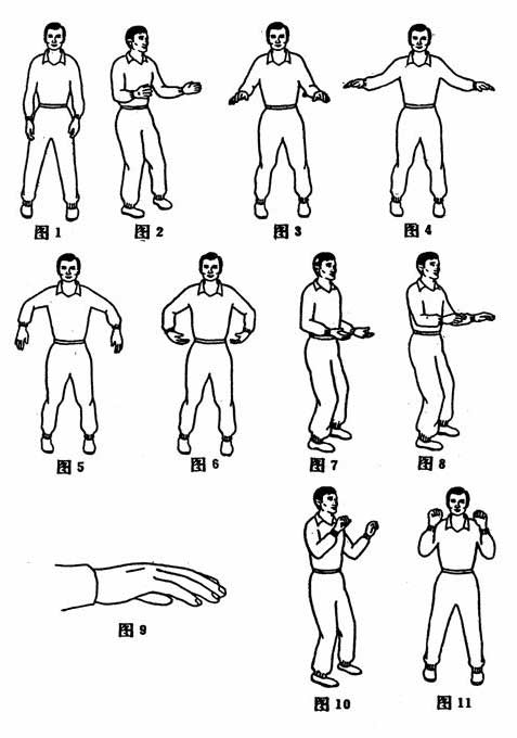 人体全身放松站立,双脚离开距离与本身两肩同宽。(以双脚外侧为准)双脚尖略向内,(略八字)两臂自然松直下垂在体两侧,掌心向体侧。双手中指对准两大腿部风市穴。(图1),双手指成梯形式。曲肘抬小臂。双掌心劳宫穴相对,小臂抬至与上臂成90度角,(图2)。在抬小臂同时双脚略曲膝下蹲坐胯,(膝盖不要超出脚尖)。下蹲角度在15至30度左右(同图2)。双掌同时翻掌,使掌心向下。双手手指还保持梯形式(图3)。然后双小臂向两侧平面拉开(图4),双肘关节向上方拉起。双手掌下沉与肘关节成一线(图5),双手腕往后抬起。使手指向后和掌心向上,接着转手腕,使双手指对准腰部两侧(图6)。然后再继续转动手腕。使双手手指向身体前方(图7)。这需要停留一息(五秒钟左右),双手指保持梯形式,掌指和小臂保持松的状态,这一动作上肩,上手臂和背部都是自然紧。让气血在肩与上臂略停留一息.然后,双肩和双臂自然放松,使气血下冲来推动双臂向前伸出至,上下臂成90度。接着双手掌同时翻掌。掌心向下(图8)。这是成马步站桩姿势。(双肘关节离身体十公分左右)。
